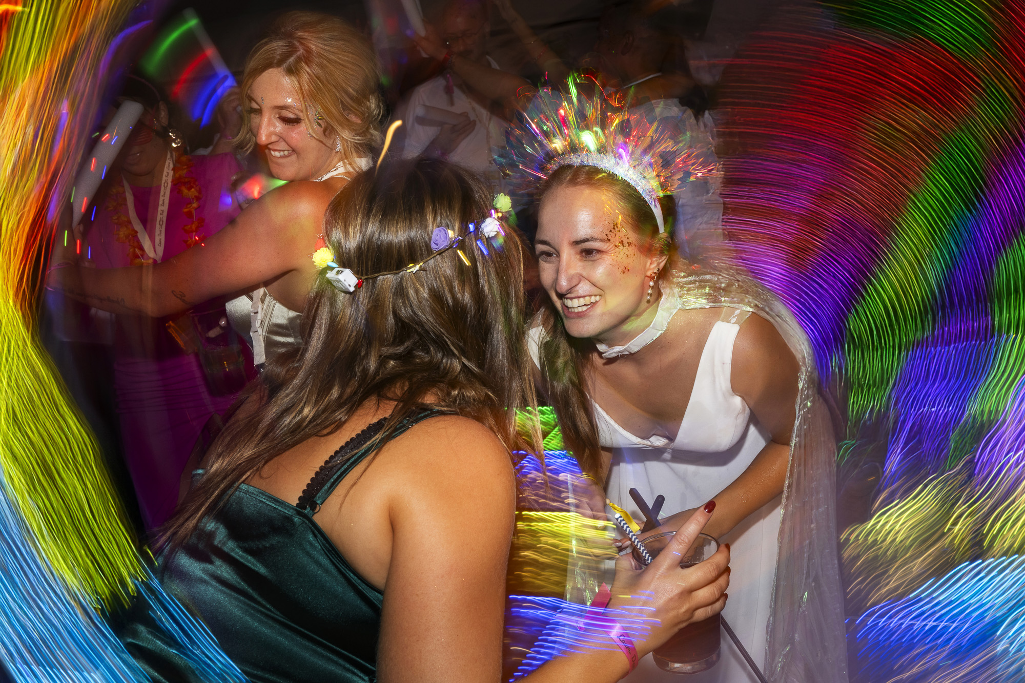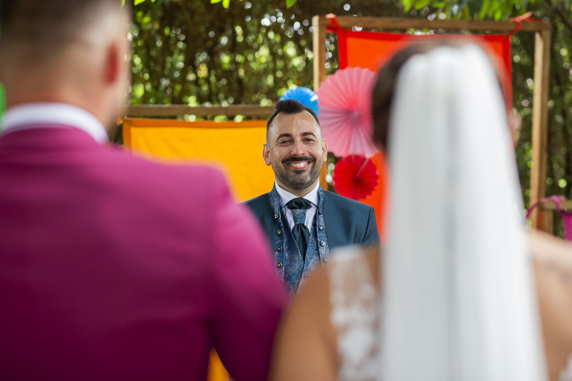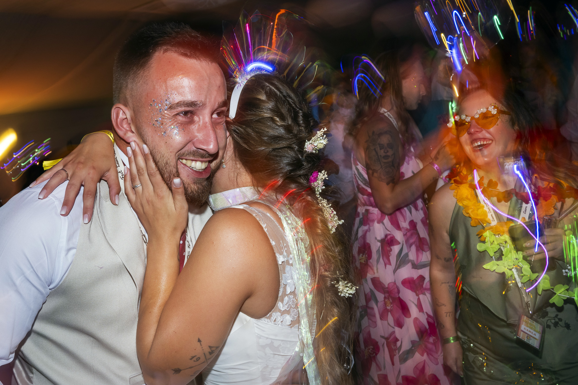 La ceremonia, al aire libre y con música indie, creaba una atmósfera íntima y auténtica. Laura caminó hacia Dani mientras sonaba una versión de su canción favorita, y la emoción se respiraba en cada mirada. Como fotógrafo especializado en bodas originales y temáticas, mi objetivo fue capturar precisamente eso: la naturalidad, la complicidad y la energía única que solo una boda festival puede ofrecer.