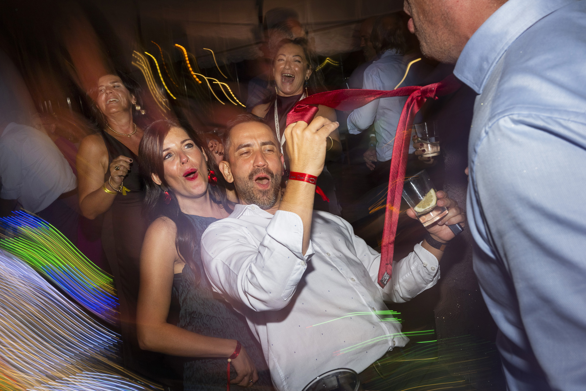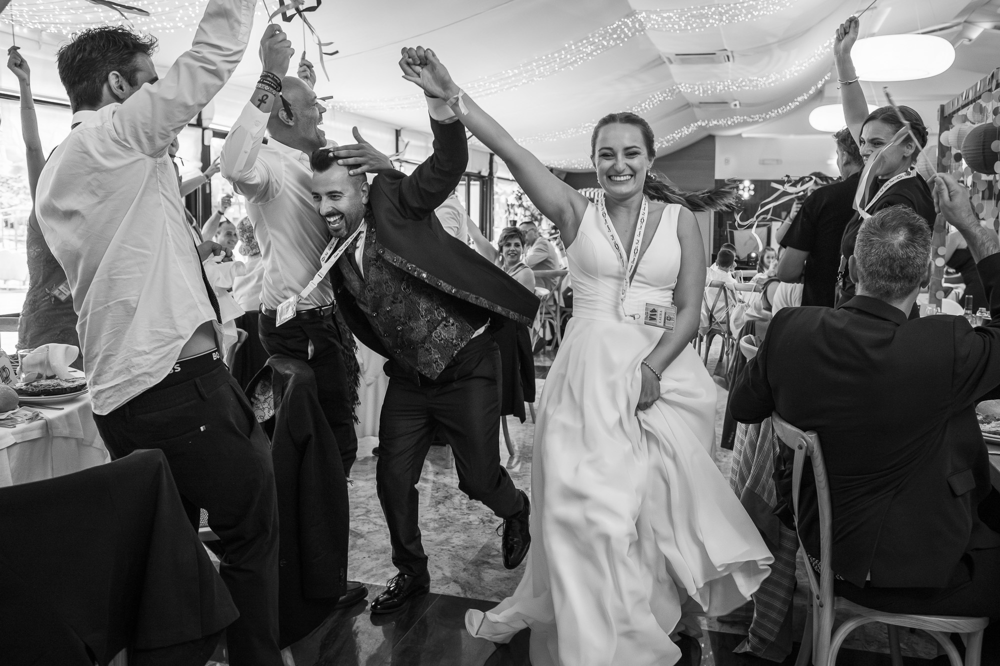 La música fue uno de los grandes protagonistas. Durante el cóctel y la fiesta sonaron himnos indie que marcaron la historia de los novios, desde clásicos de Leiva hasta temas de Vetusta Morla, creando una banda sonora perfecta para una celebración inolvidable. El baile se convirtió en un auténtico concierto privado, con luces de neón, hora loca y un público entregado que no dejó la pista vacía en ningún momento.